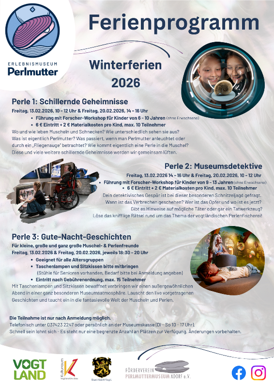 Jeweils am 13.02. und am 20.02.2026 gibt es drei "Ferienperlen" im Adorfer Perlmuttermuseum zu entdecken.