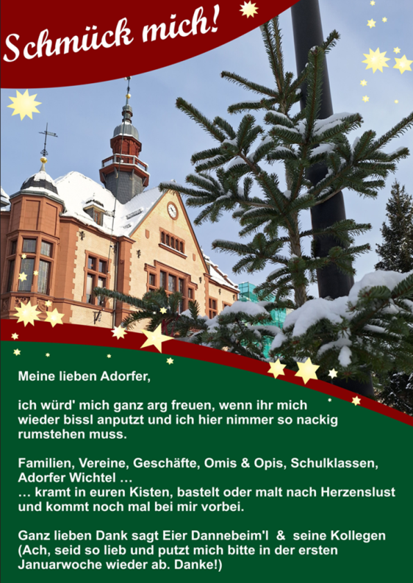 Viele Jahre gibt es diese Mitmachaktion in Adorf nun schon, und wir freuen uns wieder auf liebevoll und kreativ geschmückte Bäume. So kann die Adventszeit beginnen!