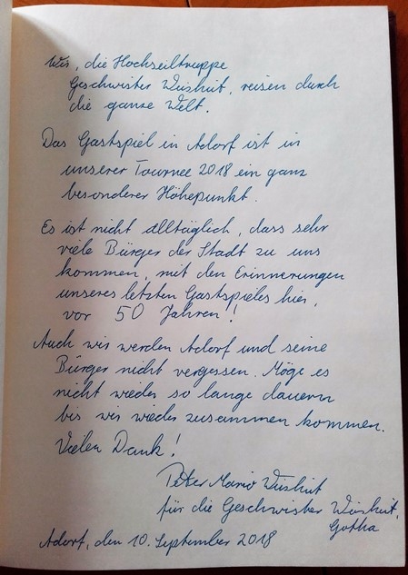 "Wir, die Hochseiltruppe Geschwister Weisheit, reisen durch die ganze Welt. Das Gastspiel in Adorf ist in unserer Tournee 2018 ein ganz besonderer Höhepunkt.Es ist nicht alltäglich, dass sehr viele Bürger der Stadt zu uns kommen, mit den Erinnerungen unseres letzten Gastspiels hier vor 50 Jahren! Auch wir werden Adorf und seine Bürger nicht vergessen. Möge es nicht wieder so lange dauern, bis wir wieder zusammenkommen. Vielen Dank!