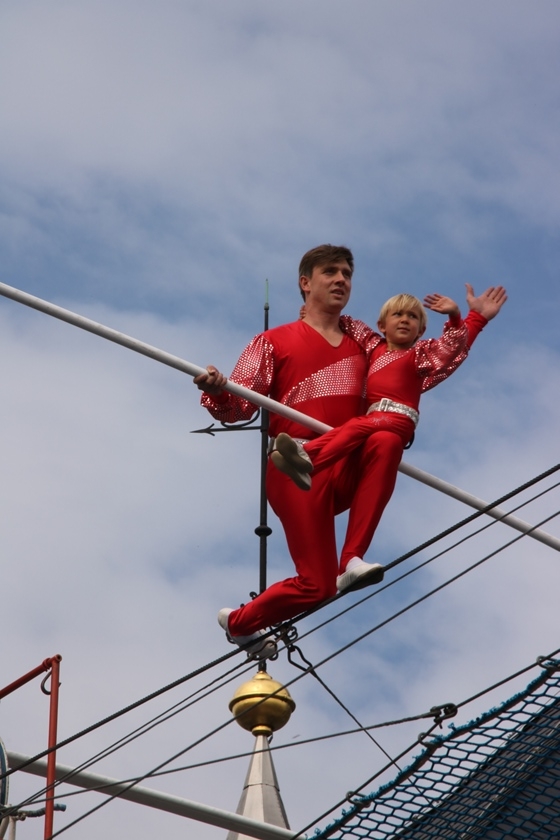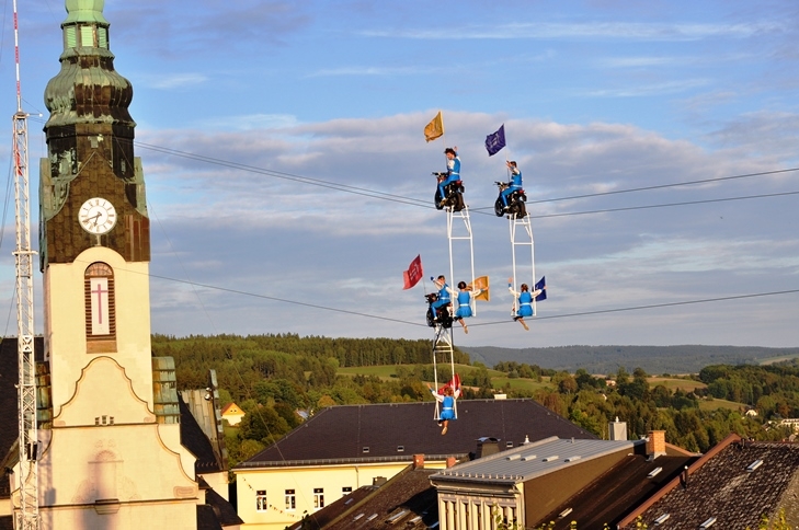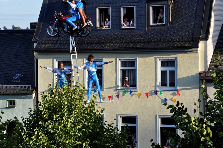 In drei verschiedenen, atemberaubenden Shows konnten die Adorfer und ihre Gäste Einmaliges erleben. Selbst das kleinste Familienmitglied nahm mit seinen vier Jahren schon teil. Absolute Höhepunkte waren die Artistikdarbietung auf einem 62m hohen Mast neben der St. Michaeliskirche und die weltweit einzigartige Hochseil-Motorradshow. Sehen Sie unten die schönsten Bilder...