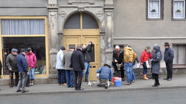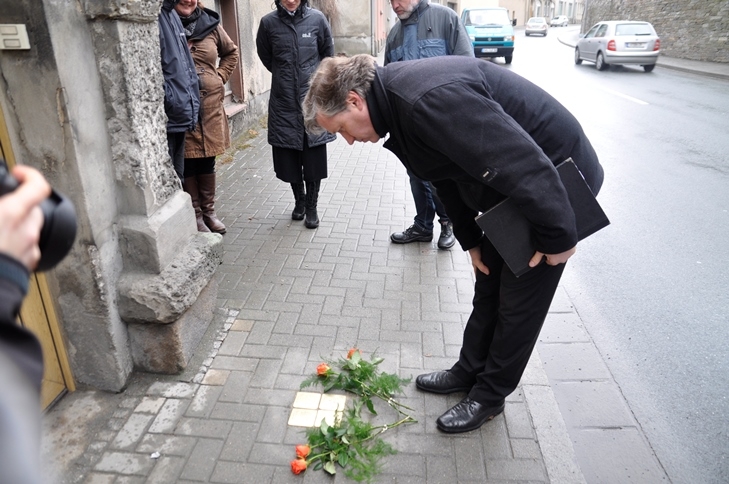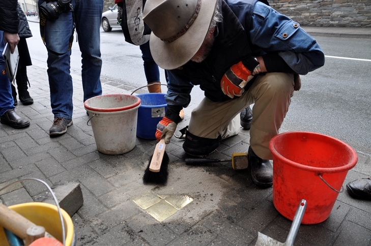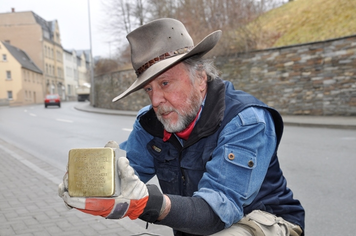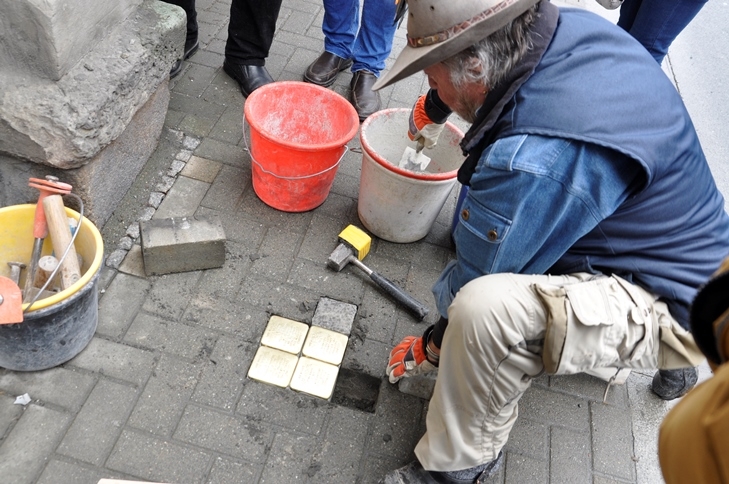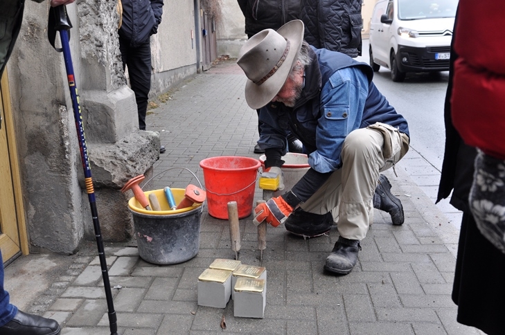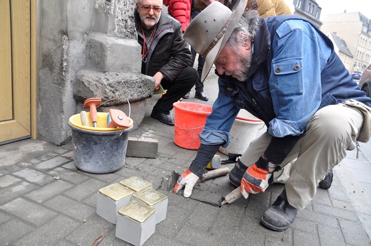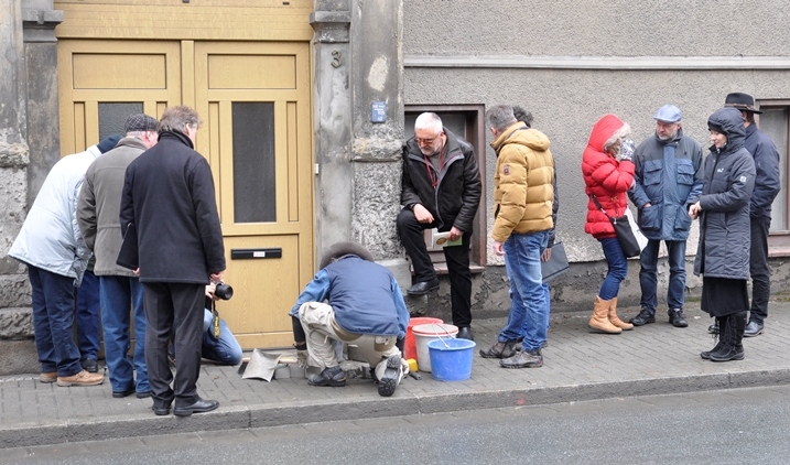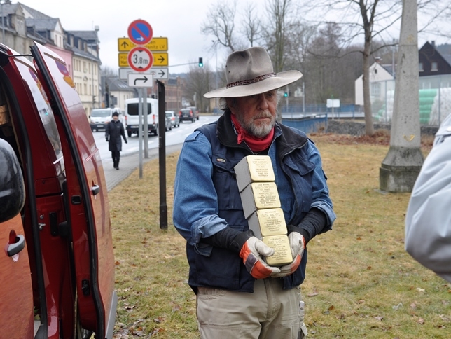 Gestern wurden vor dem Haus Elsterstraße 3 vier "Stolpersteine" durch den Künstler Gunter Demnig verlegt. Adorf ist damit die 2.130. Stadt, in der diese perönlichen Mahnmale an frühere jüdische Bürger in Europa an deren letzten Wohnorten verlegt worden sind. Ca. 20 Leute waren gekommen, um der Verlegung beizuwohnen.